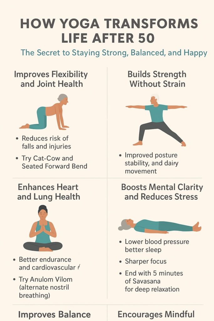 Let’s explore how yoga can transform life after 50—physically, mentally, and emotionally.